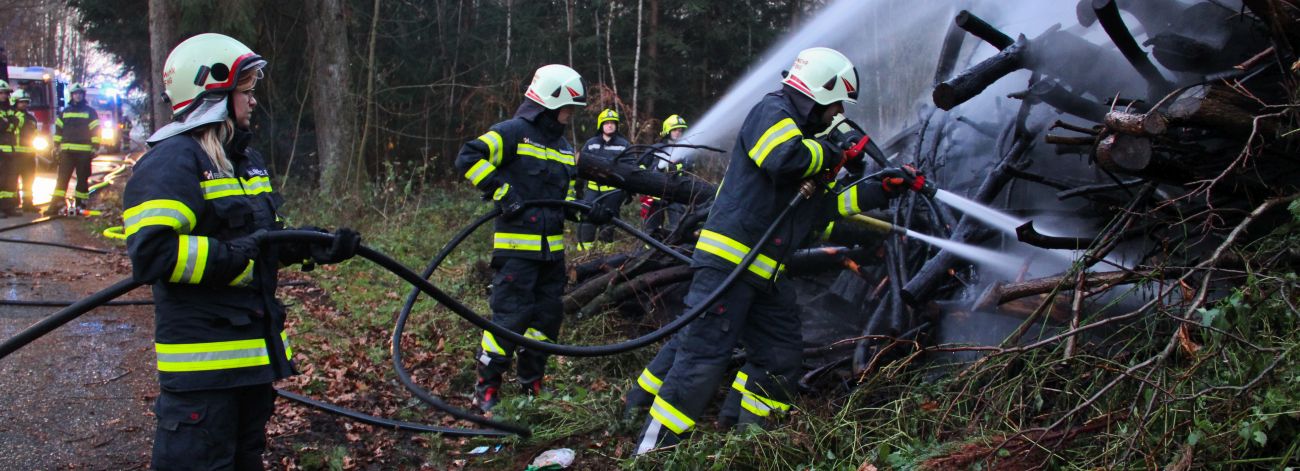 Während sich am Samstag den 17. November 20 Kameraden der Freiwilligen Feuerwehr Pimpfing gegen 06:30 trafen um an der Herrschaftsjagd in Aistersheim teilzunehmen wurden wir plötzlich vom Ertönen der Sirene überrascht. Durch die Feuerwehr Andorf über die Landeswarnzentrale alarmiert, machten wir uns umgehend mit dem Kleinlöschfahrzeug und dem erst vor kurzem zu uns verlegten Tanklöschfahrzeug auf den Weg in die Ortschaft An der Fernstraße, wo Passanten einen brennenden Holzhaufen entdeckt hatten. Die erste Aufgabe der alarmierten Feuerwehren Andorf, Pimpfing und Taufkirchen an der Pram bestanden darin, die Brandausbreitung mithilfe der HD-Schnellangriffseinrichtung zu verhindern. Anschließend wurde eine Zubringerleitung von einem nahegelegenem Hydranten zum Rüstlöschfahrzeug der Feuerwehr Andorf aufgebaut um mit ausreichendem Wasservorrat erfolgreich die Brandbekämpfung durchführen zu können.